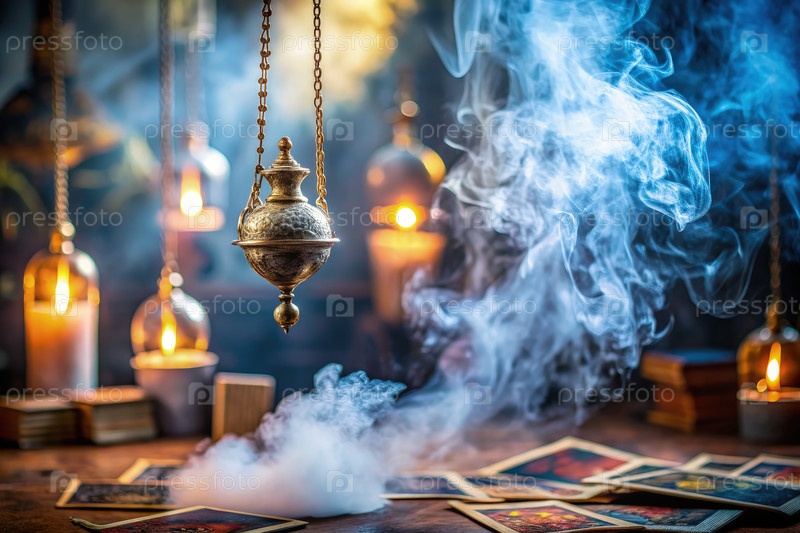 Золотое маятник мягко качается над таровыми картами и дымом фимиама