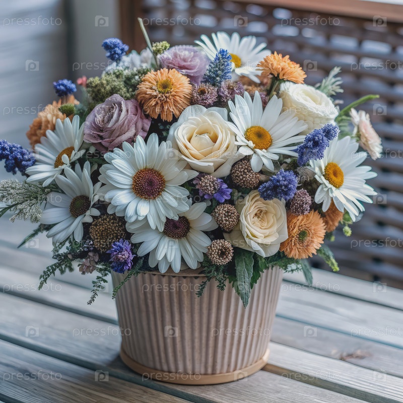 Вибрирующий букет ромашек, роз и лаванды в деревянном горшке
