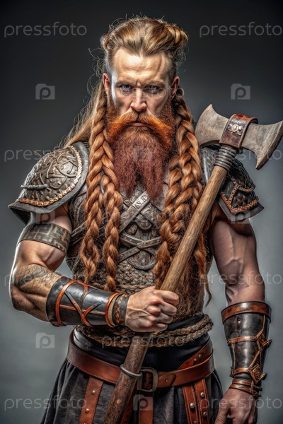 Мощный воин-викинг с сплетенными волосами и красной бородой