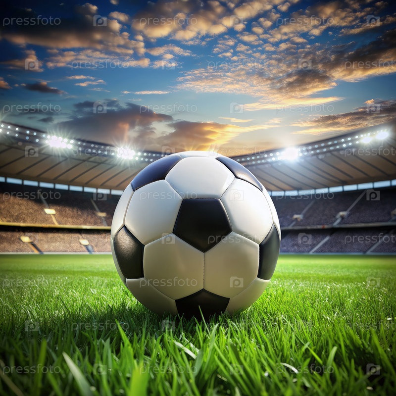Футбольный мяч сидит готовым на стадионе при закате солнца