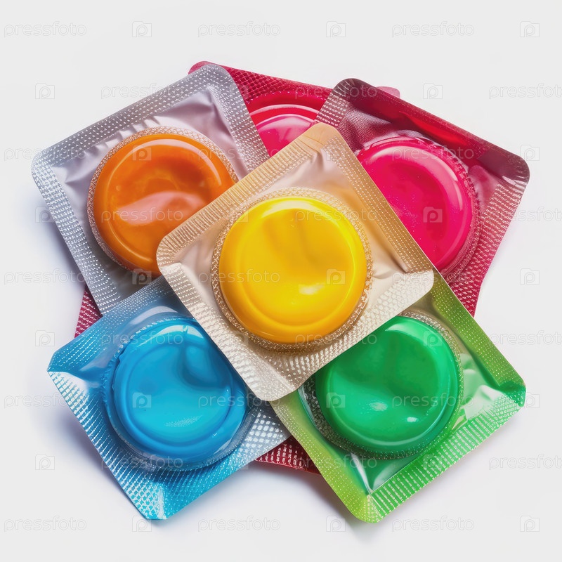 Вид красочных презервативов в индивидуальной упаковке на белом фоне