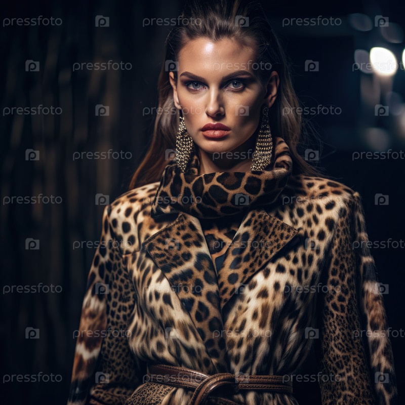 Модная модель, одетая в печатный пальто леопарда во время ночного шоу моды