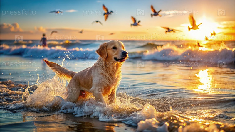 Щенок золотистого ретривера играет в океанских волнах на закате