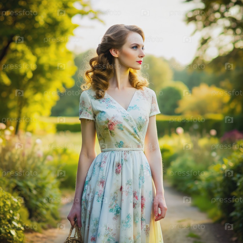Женщина в цветочном платье идет по садовой тропинке