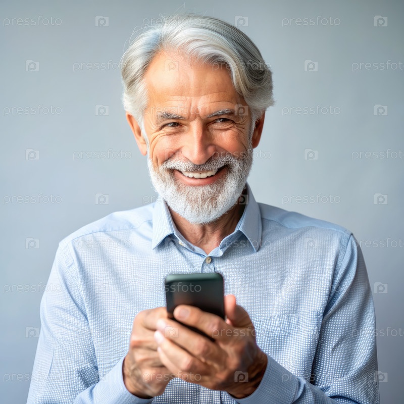 Веселый пожилой мужчина использует смартфон в помещении