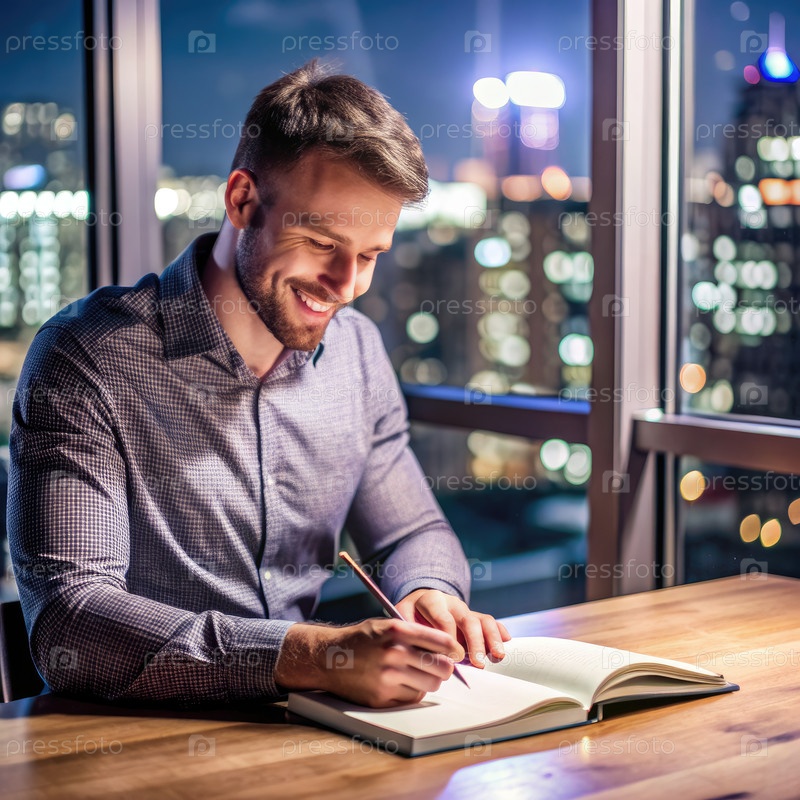 Молодой человек пишет в блокноте за рабочим столом с видом на городские огни