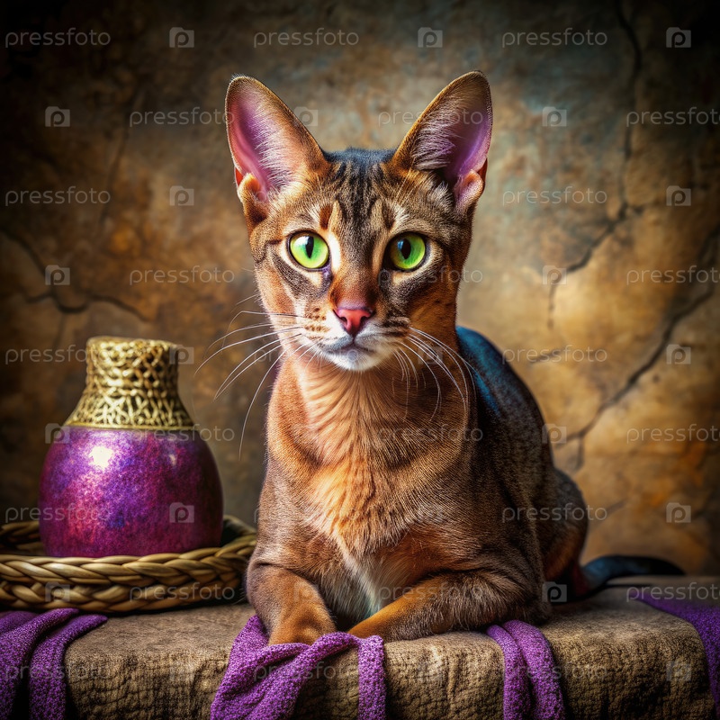Удивительный абсинийский кот с зелеными глазами позирует на деревенской столовой