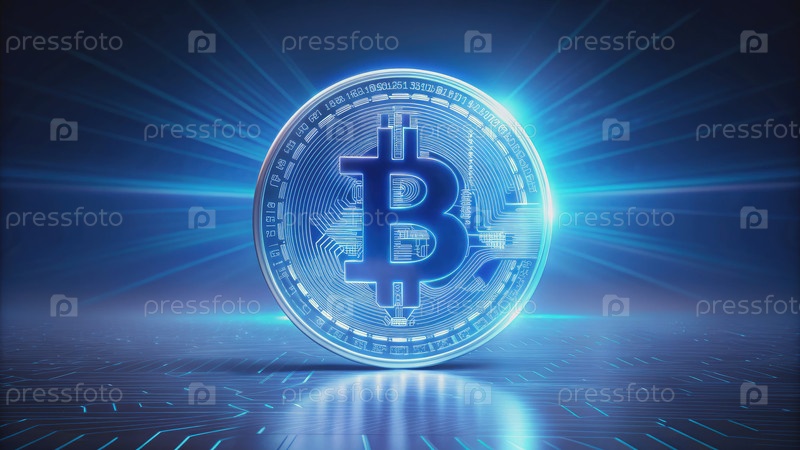 Светящаяся голограмма Bitcoin на фоне синего градиента. генеративный ИИ