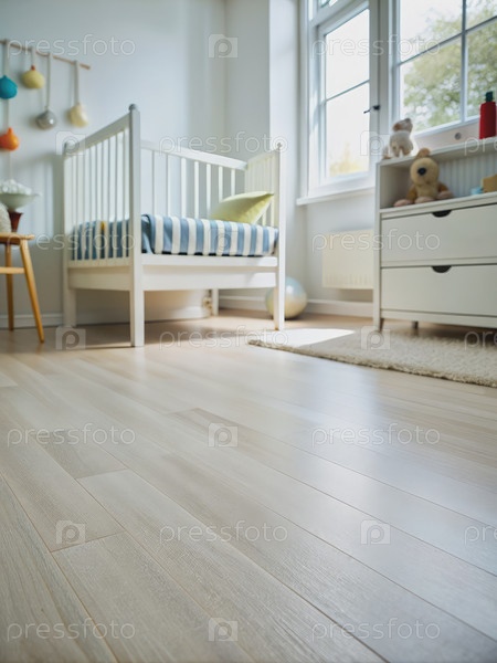 Ближайшее сближение белых деревянных полов в яркой, современной питомнице