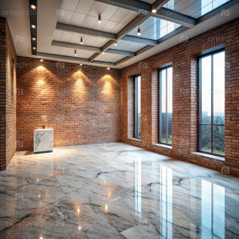 Дизайн интерьера с открытыми кирпичными стенами и мраморным полом