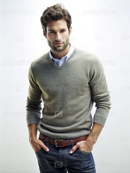 Портрет мужчины в сером свитере и джинсах