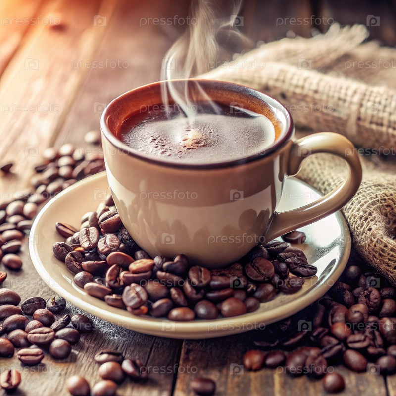 Парущая чашка кофе на деревянном столе с жареными бобами