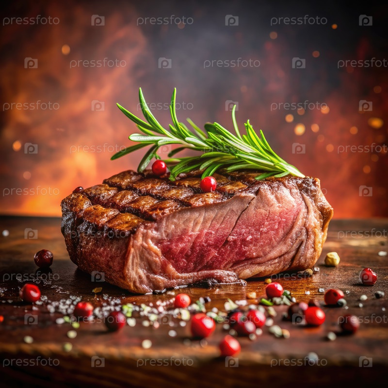 Стейк из сухого говядины на гриле с розмарином и перцовыми косточками