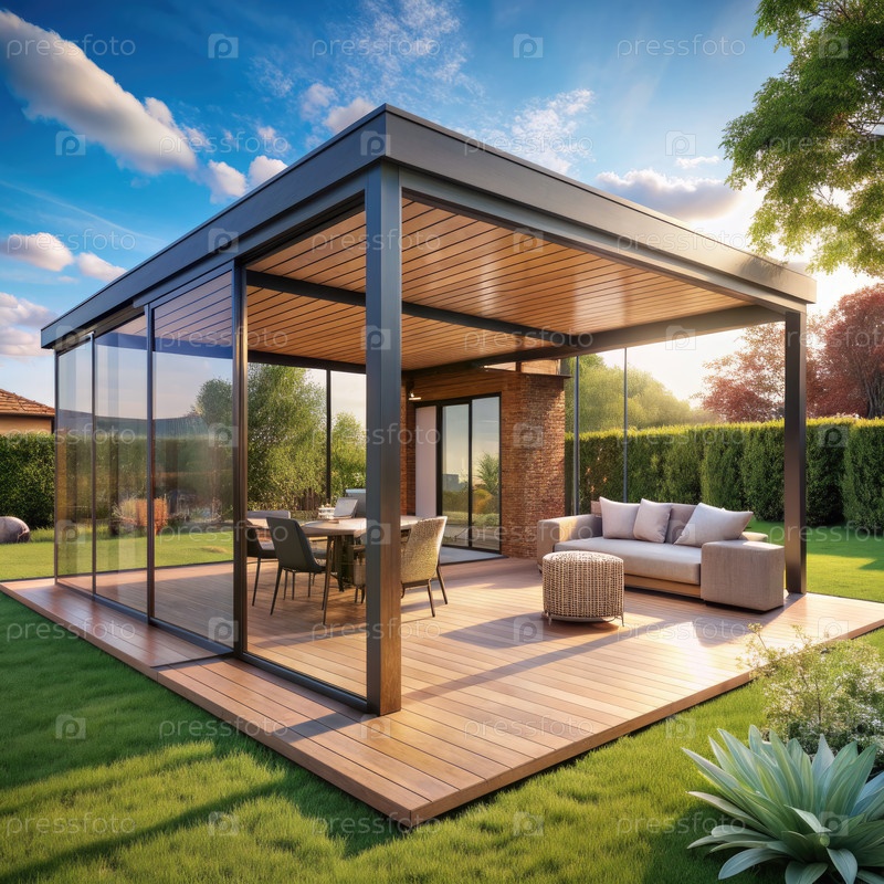 Панорамный беседка без рамы со стеклянными стенами и деревянной палубой