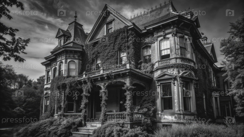 Переросший викторианский особняк в черно-белом цвете