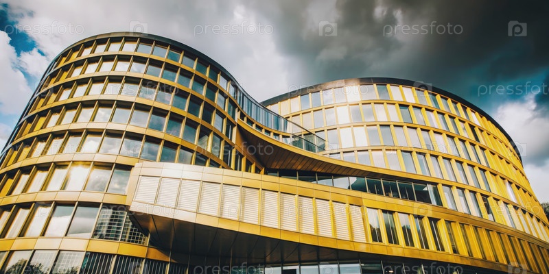 Стеклянное здание с дизайном асимметричной эллипсы под облачным небом. генеративный современный ИИ