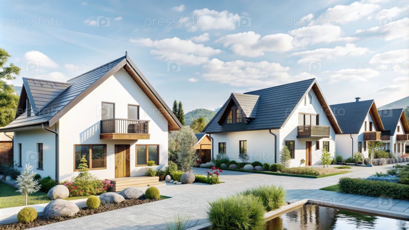 Спокойные деревенские дома с прудом и роскошным ландшафтом в солнечный день