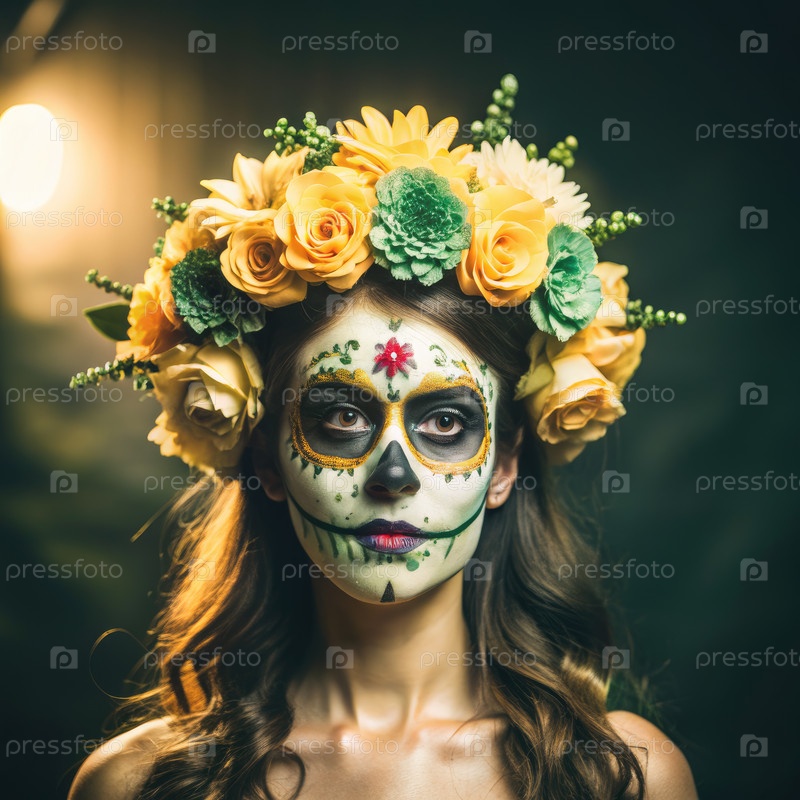 Женщина, носящая традиционный макияж Дня мертвых и цветочный головной пояс