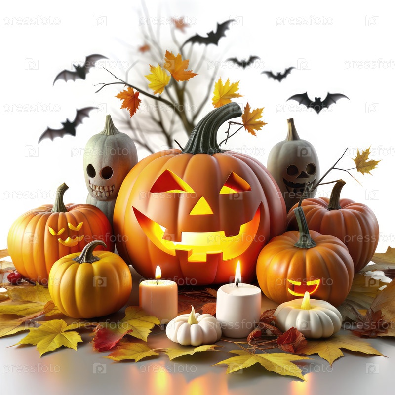 Вырезанный фонарь с зажженными свечами и летучими мышами на белом фоне