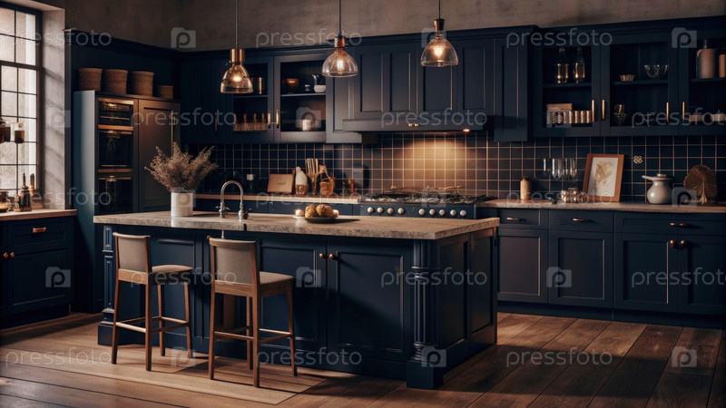 Кухня с темными шкафами и большим островом