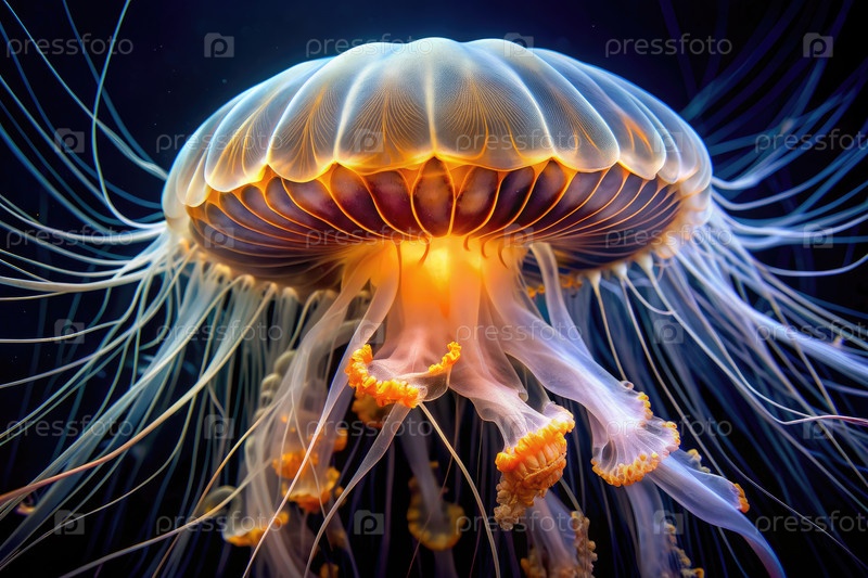 Близкий взгляд на глубоководную медузу с длинными щупальцами в темной воде