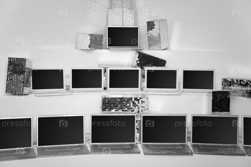 Пирамида из нескольких ноутбуков, выставленных на показ. Фотография
