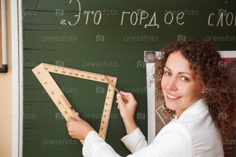 Учительница сидит на доске с линейкой и карандашом в руке. Улыбаясь, она смотрит в камеру