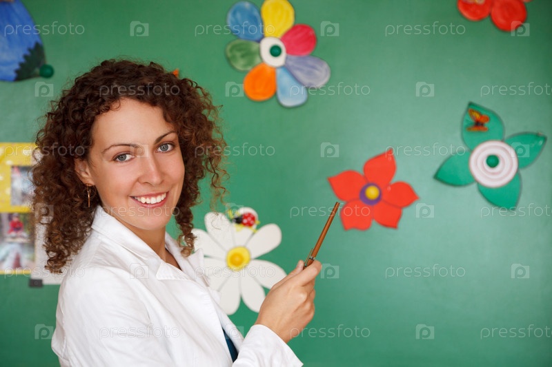 Портрет учителя раньше - перед школьным советом с ручкой в руке. Улыбаясь, глядя в камеру