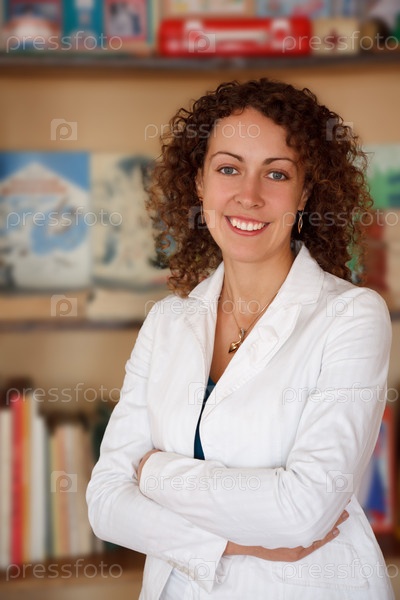 Портрет школьного учителя в белой блузке в школе