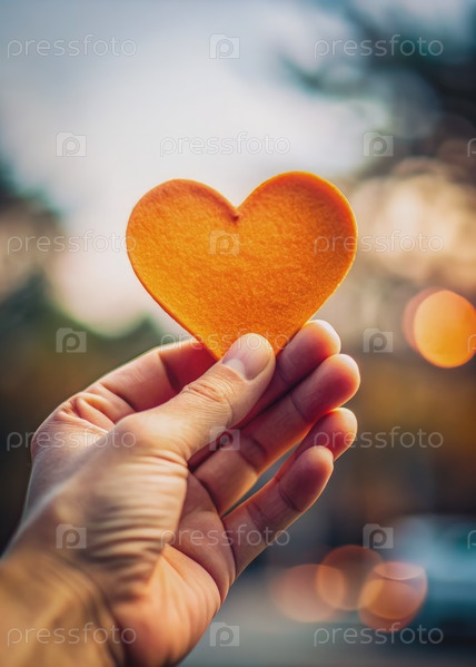 Держит оранжевую форму сердца, вырезанную на размытом фоне
