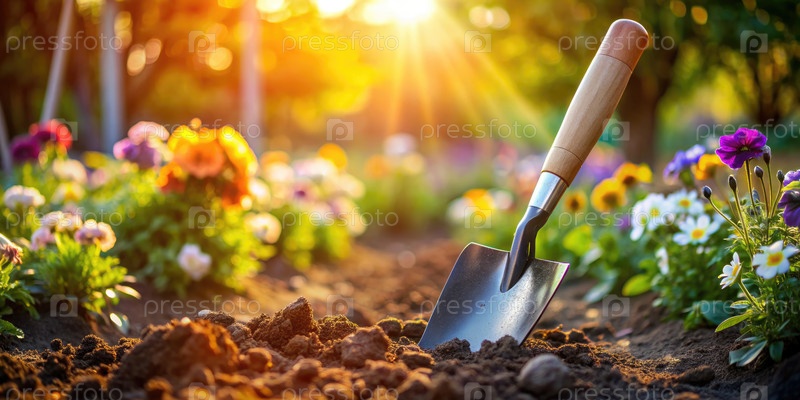 Подготовка почвы для садовых растений на закате солнца. генеративный ИИ