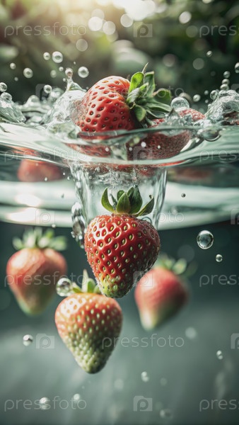 Свежая клубника, плавает в стакане воды