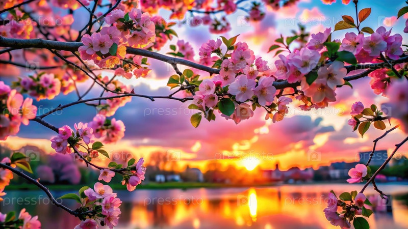 Розовые цветы обрамляют яркий закат над спокойным озером