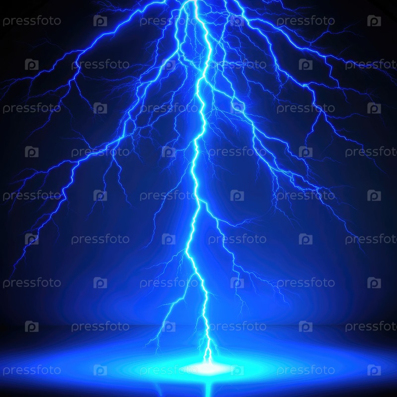 Яркий голубой молниеносный ток поражает землю против темного неба