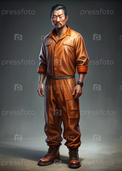Азиатский мужчина-заключенный в оранжевом комбинезоне, стоящий в серой комнате