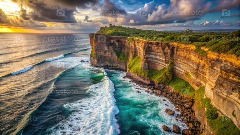 Драматический закат солнца у обрыва над бушующими океаническими волнами на Бали, Индонезия