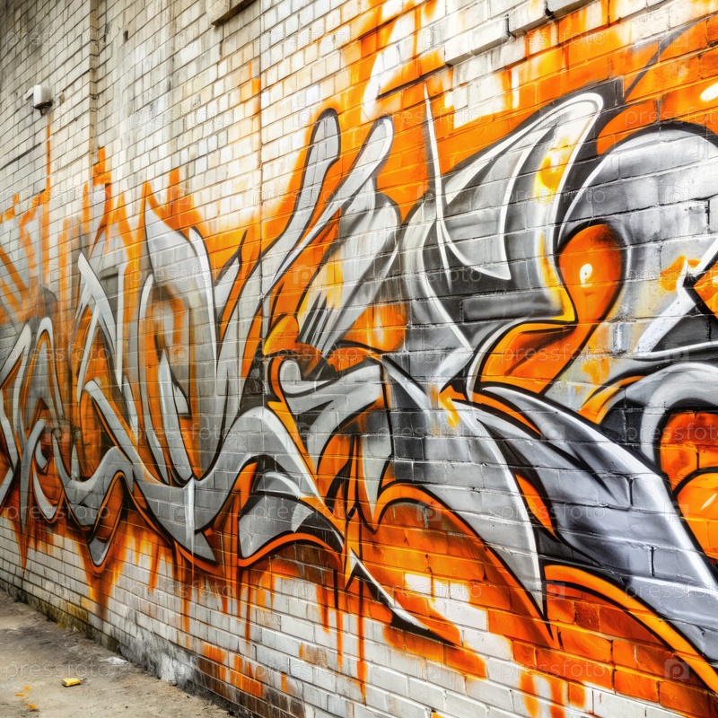 Серый, оранжевый и белый граффити на кирпичной стене в городской переулке