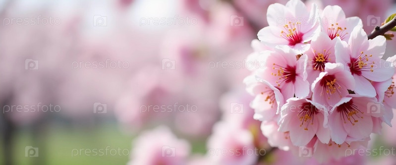Нежные розовые вишневые цветки красиво цветут на ветке дерева во время весеннего сезона, заполняя сцену яркими цветами и ощущением обновления в природе