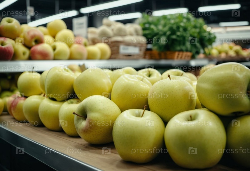 Красочный ассортимент желтых яблок аккуратно расположен на стойке супермаркета, приглашая клиентов исследовать и выбирать свежие фрукты