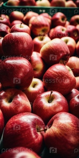 Красочный ассортимент красных яблок аккуратно расположен на прилавке супермаркета, приглашая клиентов исследовать и выбрать свежие фрукты