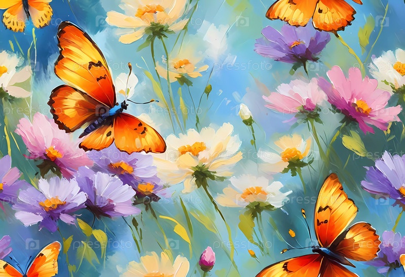 Красочные бабочки грациозно парили над ярким массивом дикорастущих цветов, создавая живую и веселую атмосферу на солнечном лугу
