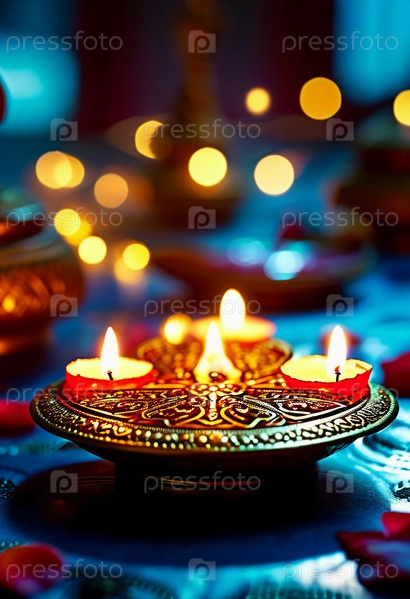 Цветные лампы дия светят мягко в темном пространстве, создавая мирную атмосферу.Этот красивый дисплей символизирует празднование Дивали и Рамадана, объединяющие культуры.Генеративный ИИ