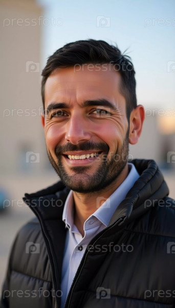 В оживленной обстановке на открытом воздухе молодой человек тепло улыбается, демонстрируя свое дружелюбное поведение