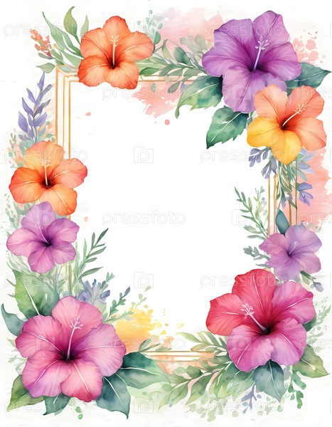 Вибрирующее оформление цветов гибискуса и петунии, предназначенное для особых случаев, с гармоничным сочетанием цветов и пробелом для персонализированных сообщений Генеративный ИИ