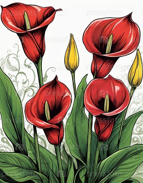Ярко окрашенные калла-лилии заполняют холст среди пышных зеленых листьев на ярком фоне, создавая привлекательный цветочный дисплей
