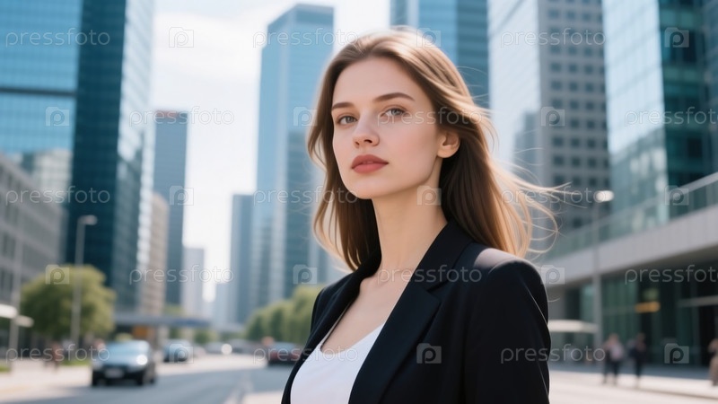 Красивая европейская американка гордо стоит в оживленном городе, солнечный свет освещает ее грациозные черты лица.Окружена высокими небоскребами, она излучает уверенность и стиль Generative AI