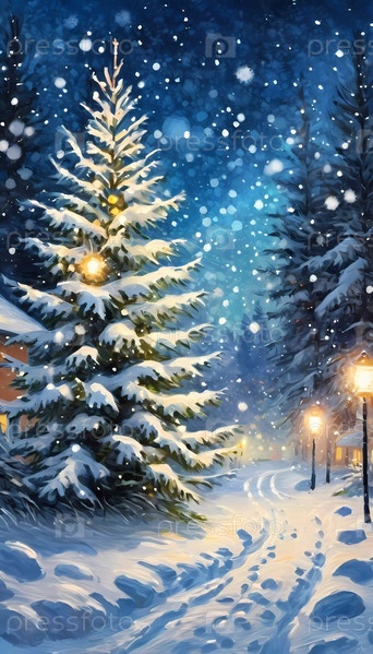 В спокойную снежную ночь мягкие боке-рождественские огни украшают еловые ветви среди живописного пейзажа. Видны уютные дома, излучающие тепло и празднование в стране зимних чудес
