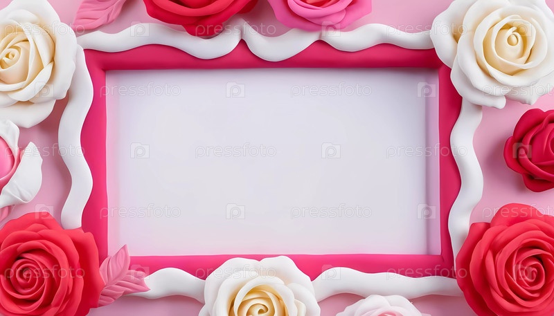 Яркая рама, украшенная красными, розовыми и белыми розами, установлена на мягком розовом фоне, обеспечивая идеальное пространство для личных сообщений или драгоценных воспоминаний