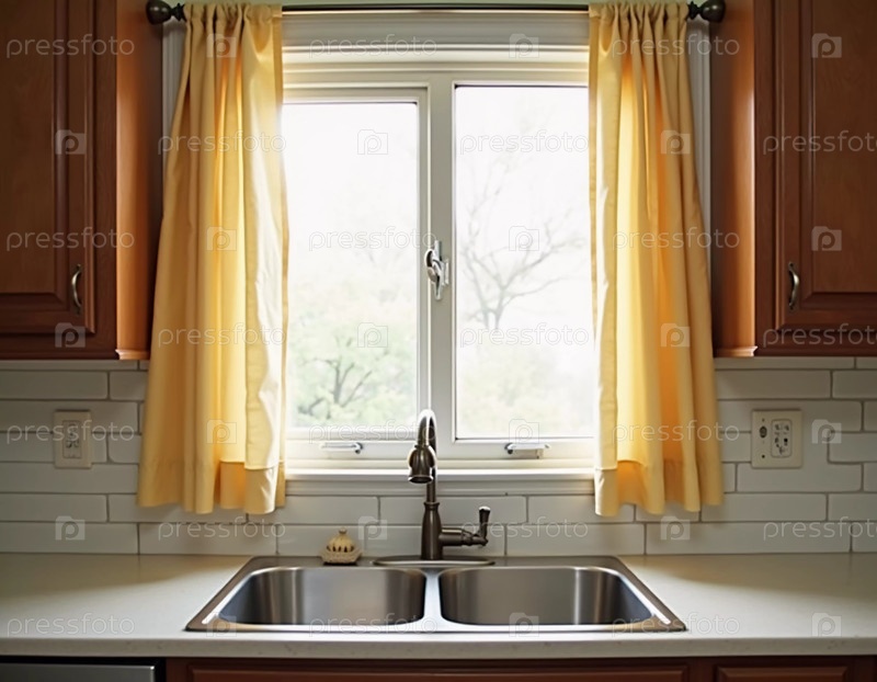 Мягкие оранжевые кухонные шторы грациозно висят у окна, позволяя нежному дневному свету улучшить уютный интерьер