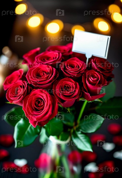 Красиво устроенный набор красных роз окружает пустую карточку, идеально подходящую для выражения романтических чувств